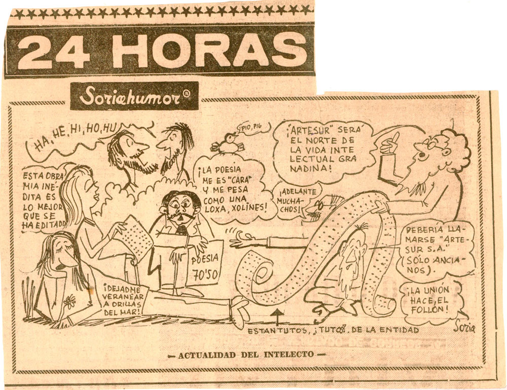 Diario Patria, Granada.- El dibujante Soria refleja el ambiente cultural granadino en una caricatura publicada el 16 de diciembre de 1969. ¡La poesía me es "cara" y me pesa como una Loxa, xolines.